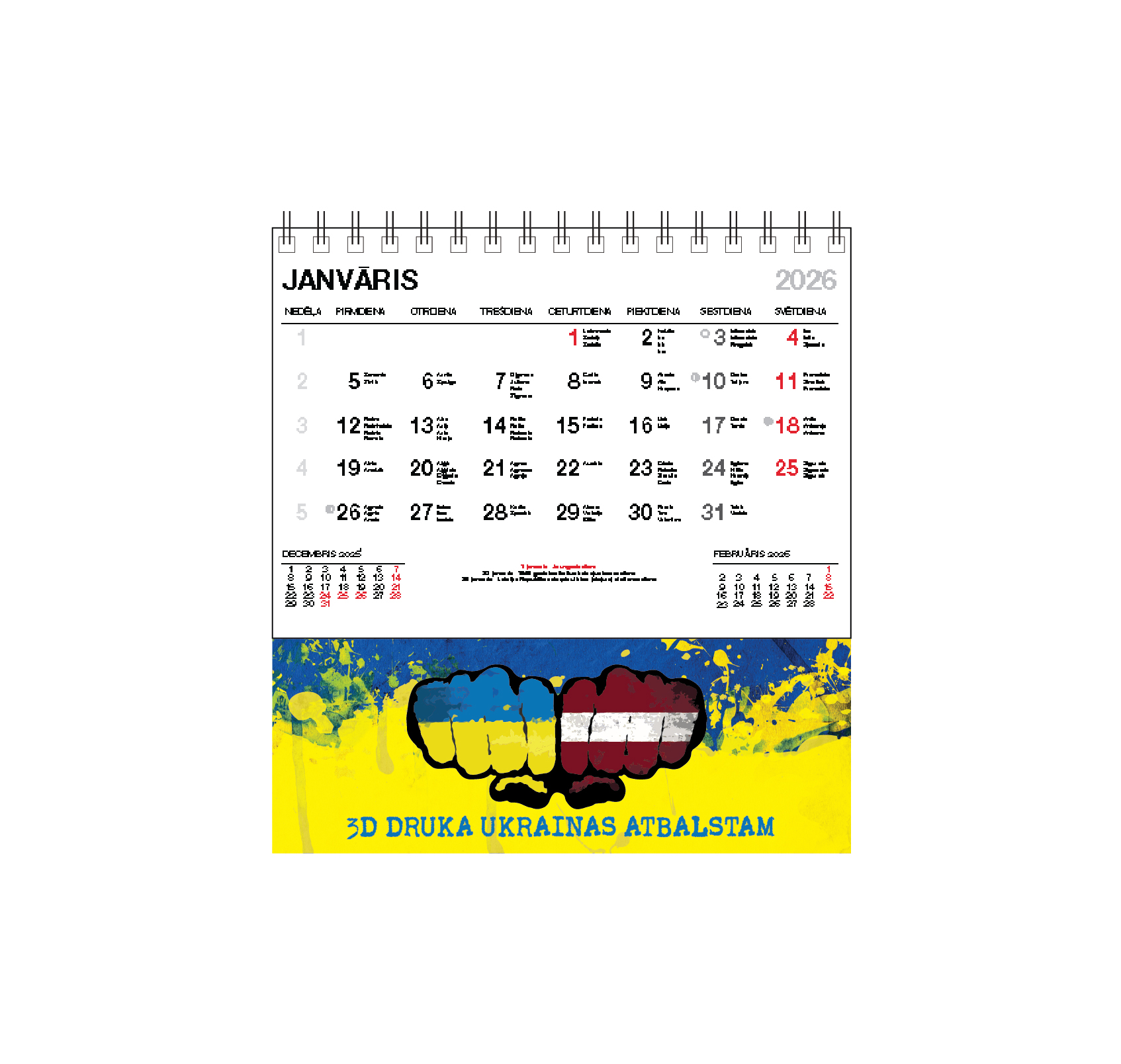 Nopērkot šo galda kalendāru palīdzēsi iepirkt Ukrainas aizstāvju dronu “astīšu” drukai nepieciešamos materiālus. Uzņēmums nopirkto materiālu pārvērtīs “astītēs” ar